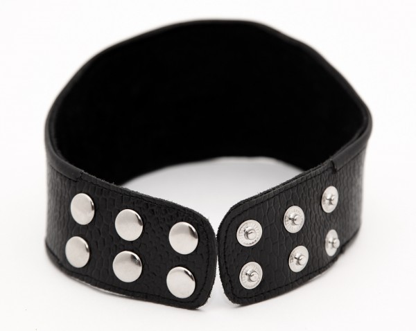 Застеги­ва­ется ошей­ник при помощи метал­ли­че­ских клепок. Клепки в 3 ряда, что гаран­ти­рует иде­аль­ную фик­сацию на шее любого объема! Легко фиксировать, легко снимать!